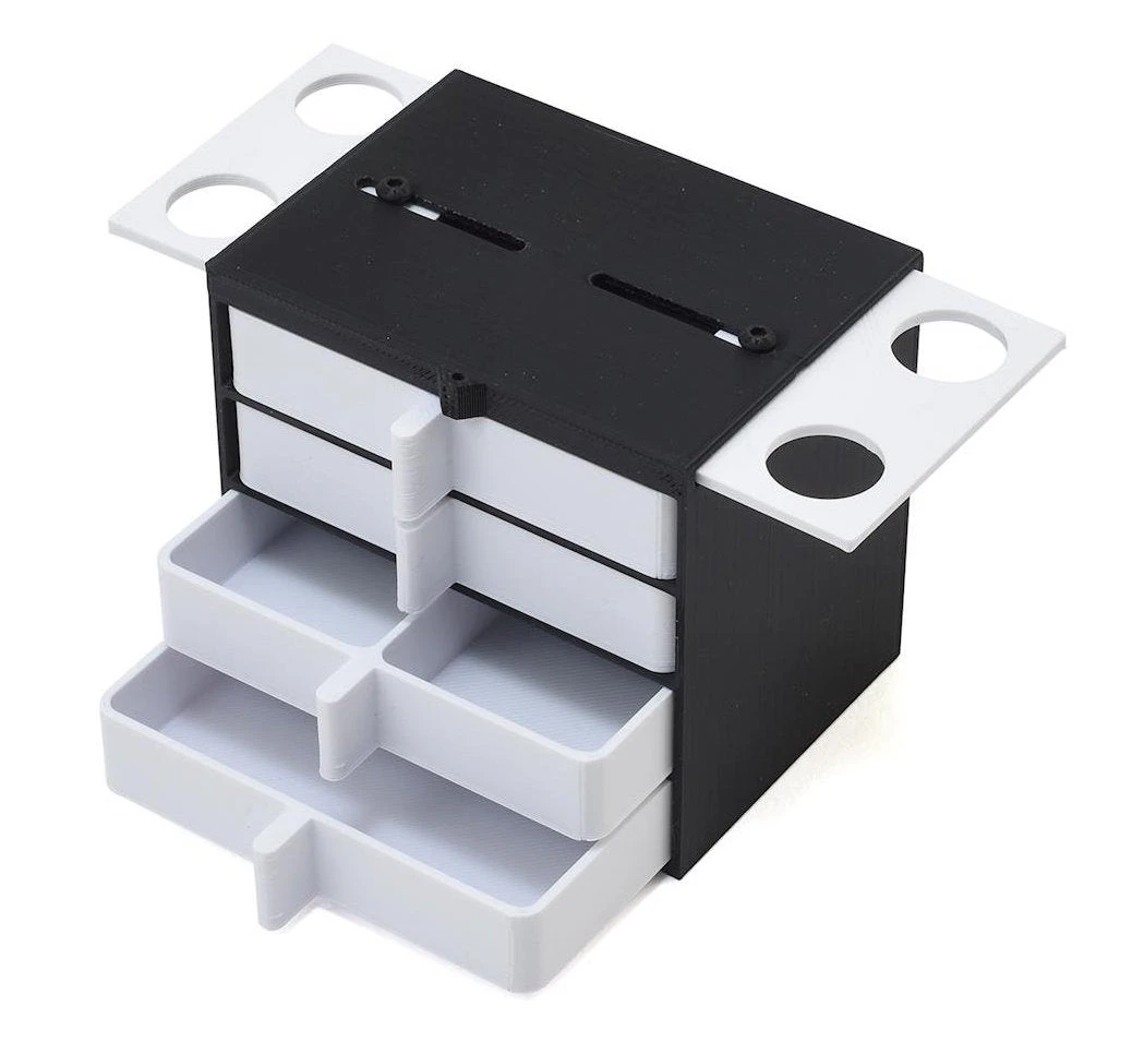 Gravity RC Pit Locker is a handy 3D printed storage container that will allow you to store small parts in the four drawers, and also features two small sliding plates on the top that provide a place to hang your shocks during a rebuild. The drawers are partitioned to optimize storage, with two drawers having four small cavities, one drawer with two cavities, and one drawer with one large cavity. The drawers are held closed using an included long body clip.