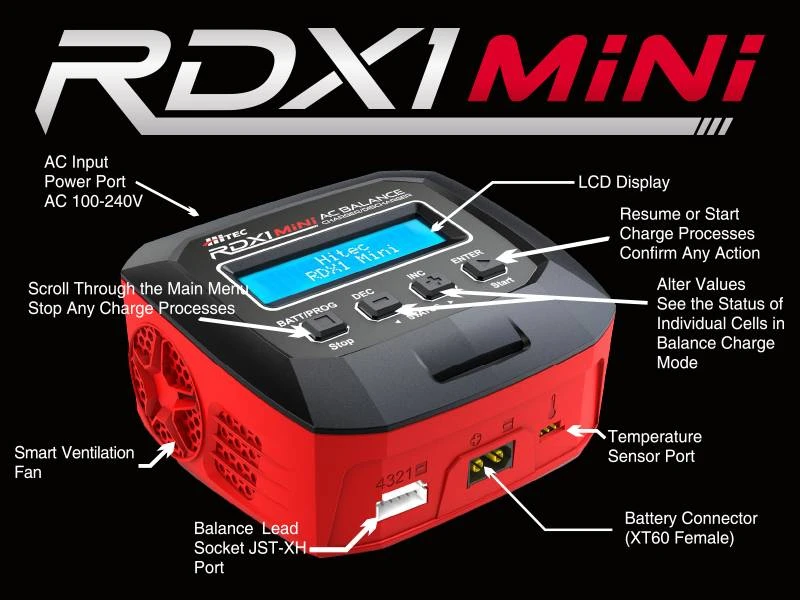 Expanding on the popularity and superior performance of our RDX1 charger line, we are proud to introduce the AC input, micro processor RDX1 Mini. Hitecβs sleekly-designed, compact AC charger packs 65 watts of power into a fraction of the size of most chargers to meet your battery management requirements. It is compatible with a full range of the most popular battery types, including the new generation LiHV. With 6 amps of maximum charging current and 2 amps of discharging current, our RDX1 Mini is the next best way to stay charged with Hitec!