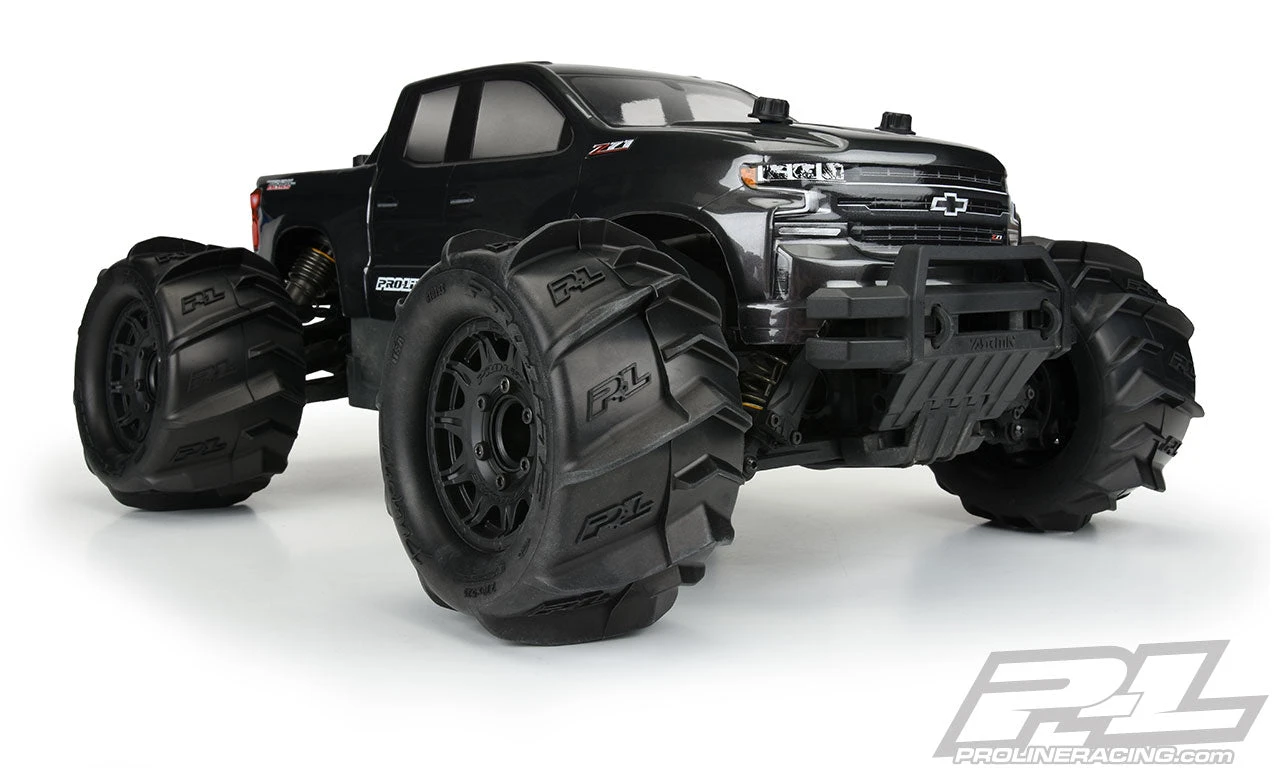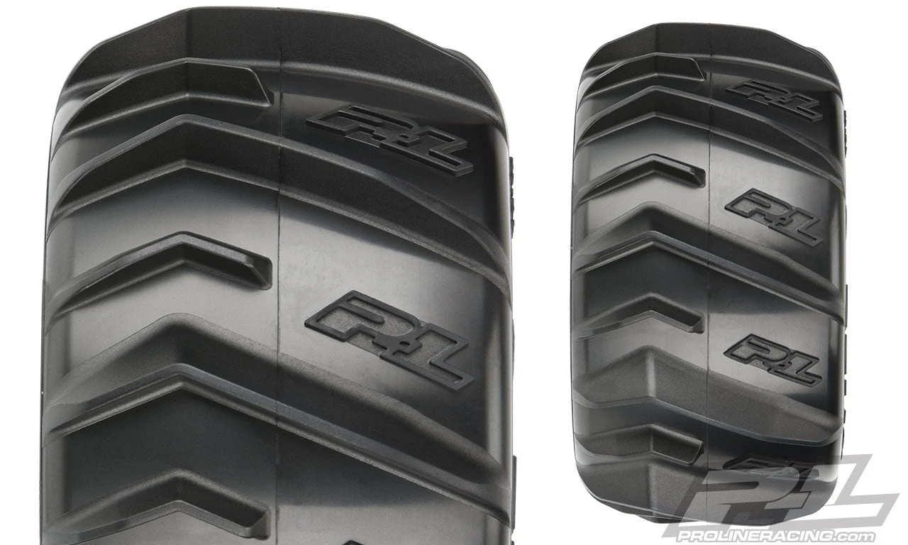 The Dumont 2.8″ tire uses the latest in paddle tread technology with large offset V-shaped paddles for maximum roosting power. Pro-Line P-L logos have been embedded into the tire carcass giving it the style that you have come to expect from Pro-Line. The Dumont Paddle tire gets its name from the incredible Dumont Sand Dunes in California, but these paddle tires are equally at home shredding your local snowfield in the winter. Don’t get stuck spinning your tires in the sand or snow. Get a set of pre-mounted Dumont Paddle tires for your 1:10 Monster Truck today!