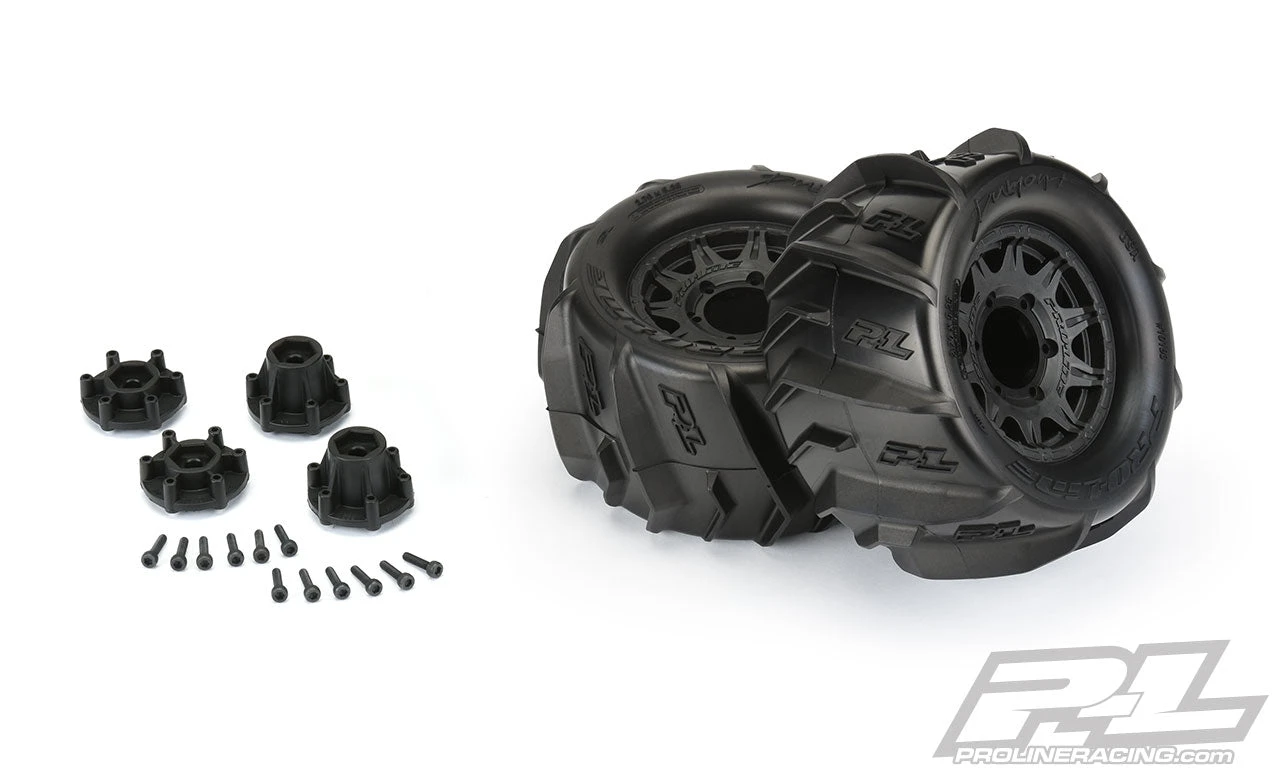 This is a pair of pre-mounted Dumont 2.8″ Tires on Raid Black 6×30 Removable 12mm Hex Wheels. Are you ready for the most extreme 2.8″ Paddle tires Pro-Line has ever made for 1:10 Monster Truck? Introducing the all-new Dumont 2.8″ tires that have been designed from the ground up to sling sand and snow further than ever before and look good doing it!