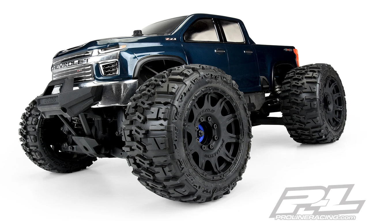 This is a 2021 Chevy® Silverado™ 2500 HD Clear Body. Pro-Line is proud to bring the latest Chevy® Silverado™ 2500 HD body style to your Monster Truck! Pro-Line has carefully recreated the details of the new 2500 HD and made it fit the E-REVO® 2.0 and MAXX® when using Extended Body Mounts like Pro-Line’s 6307-00 or 6370-00. Proudly Made in the USA, this body is made from durable polycarbonate material that allows you to put your custom paint job onto your body. Paint-then-peel overspray film, window masks, and scale Pro-Line decals are included with the body to take it to the next level. Don’t roll up with the same body as everyone else; get your own 2021 Chevy® Silverado™ 2500 HD Clear Body today!