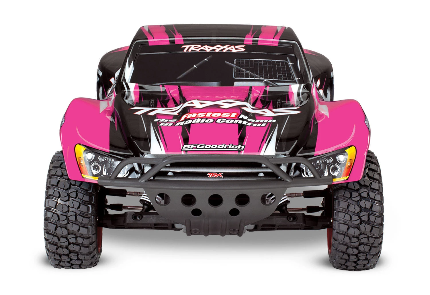 The award-winning Traxxas Slash short-course race truck puts you in the driver’s seat for intense fender-to-fender, high-flying off-road action. Full-scale short-course race trucks embody the spirit of Traxxas RC with their extreme 900+ horsepower racing engines full-throttle, dirt-roosting power slides, giant suspension travel, and big-air jumps. The Traxxas Slash brings all the action home so you can experience the high-speed head-to-head competition at the track or in your own backyard. The rear-wheel drive Slash is purpose built to fly over jumps and rip full-throttle through the turns. Slash hangs it out for an all new way to challenge your driving skills. The 4-wheel independent suspension has been carefully tuned to replicate the real world driving and handling experience as closely as possible. The scale appearing tires provide just the right amount of bite and thick, blinding clouds of dirt roost.Â